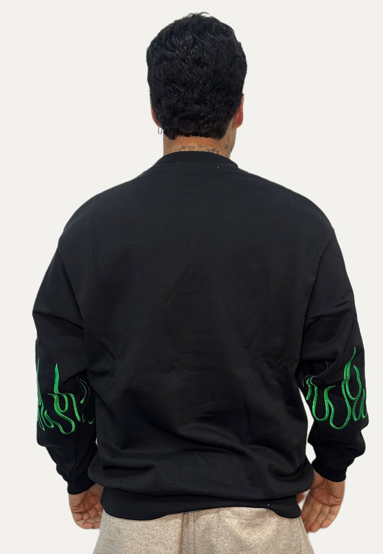 Felpa giriocllo nera con fiamme verdi ricamate. Logo ricamato sul colletto.
